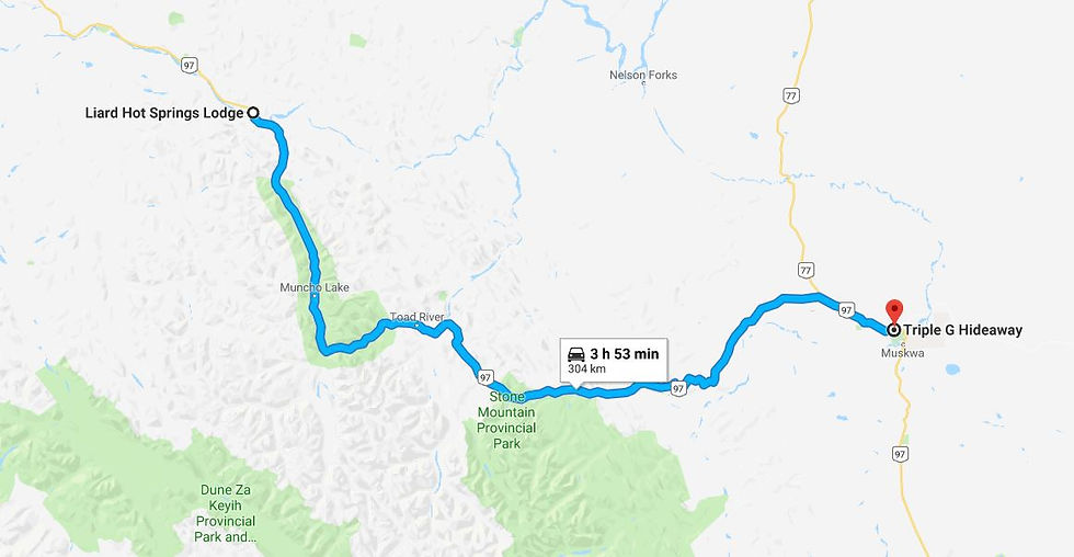 We are headed to Triple G Hideaway RV Park and Campground in Fort Nelson, BC, CA. We stayed there on Canada Day in July. The time and distance from Liard Hot Springs Lodge to Triple G Hideaway RV Park and Campground in Fort Nelson, BC, CA is 3h 53m (304 km (189 miles))
