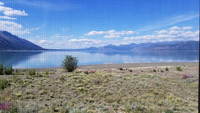 When we reach the lake we stop at a turnout. The entrance is a steep grade, but I still go in without incident. Later on, we see big rigs and campers drive to the other entrance to avoid the steep grade. The turnout is massive. The view is a dream come true. Beautiful beach, mountains with patches of snow, glass water, and green mountains ahead.