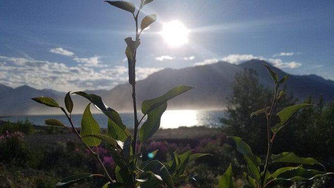 In front of us we see a large body of water. Driving closer we see a sign for Kluane Lake. We are still a few kilometers before getting to the lake, but the size become so evident as we get closer.