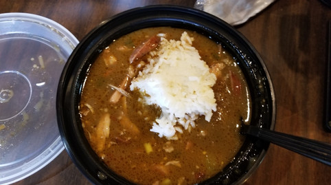 We walked in and found so much exotic meat and boudin combinations. We asked over at the Restaurant side if they had Gumbo. We were told on a rainy day everyone has gumbo. They said no, so disappointing. Over on the market side we asked someone on a lesson on boudin and what to pick. We picked up a cooler and started packing with boudin Sausage, balls and quail stuffed boudin. Lora found some side dishes they had as well. At the counter we asked if they had any suggestions for Gumbo. Bergeron's had cooked boudin and other items for sale at the counter. One of the gentlemen said he had just made a pot. If we were interested he can get us some. We said great and bought our goods. We sat down with our boudin and other items. The man brought us over the gumbo with a ball of rice in the middle. It was so good.