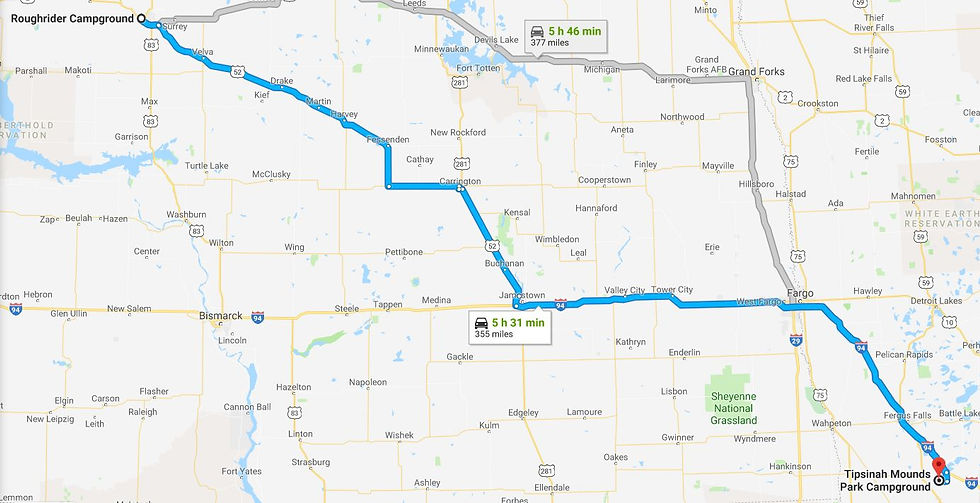 The travel time from Roughriders Campground in Minot, ND to Tipsinah Mounds Park Campground in Elbow Lake, MN is 5h 31m (355 mi). Pulling the camper our travel time was 6h 11m along with the stops.