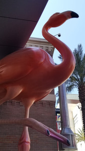 We headed back toward Treasure Island. Lora was getting slower and slower from the head her hip. We also needed to eat. We walked through The Flamingo and visited the duck, humming bird and flamingo court yard for some photos.